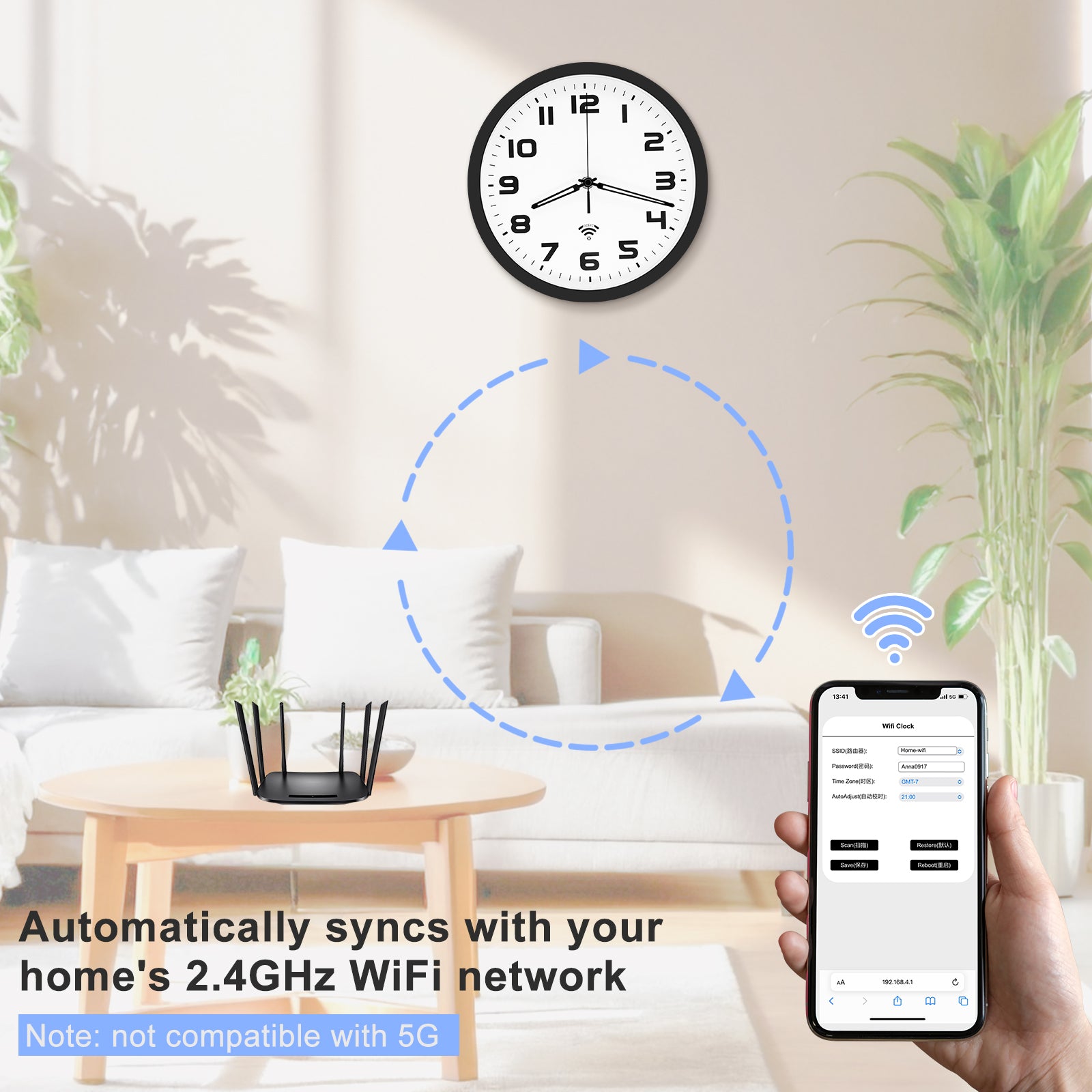 1. Smart WiFi Time Sync - Accurate & Effortless: This WiFi-enabled wall clock automatically syncs with your home’s 2.4GHz WiFi network (Note: not compatible with 5G). It synchronizes with internet time servers for precise, second-by-second accuracy. No need for frequent adjustments—just set it once, and it will automatically update for Daylight Saving Time (DST). Ideal for areas with weak radio signals or distant from atomic clock sources, offering greater convenience than traditional atomic clocks. Enjoy reliable timekeeping without constant manual updates!