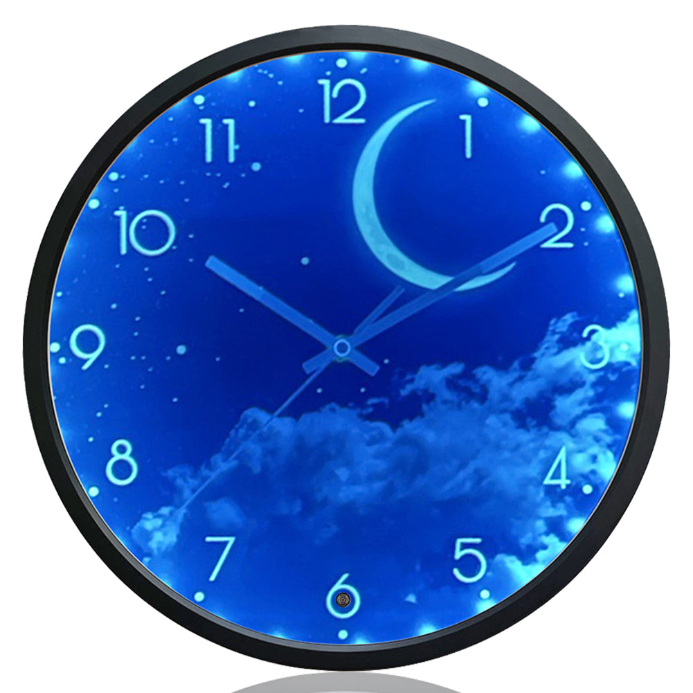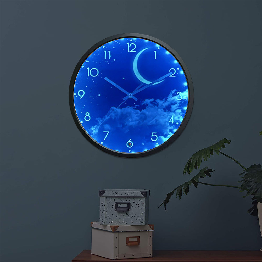 - 【Kids' Gift wall clock battery operated】This fluorescent moon-themed and soft blue led lighted two-in-one wall clock makes kids' bedroom full of vitality, perfect for your children's room. The clock movement is powered by a 1 x AA battery (Not Included). While the led rings are powered by 4 x AA batteries (Not Included)