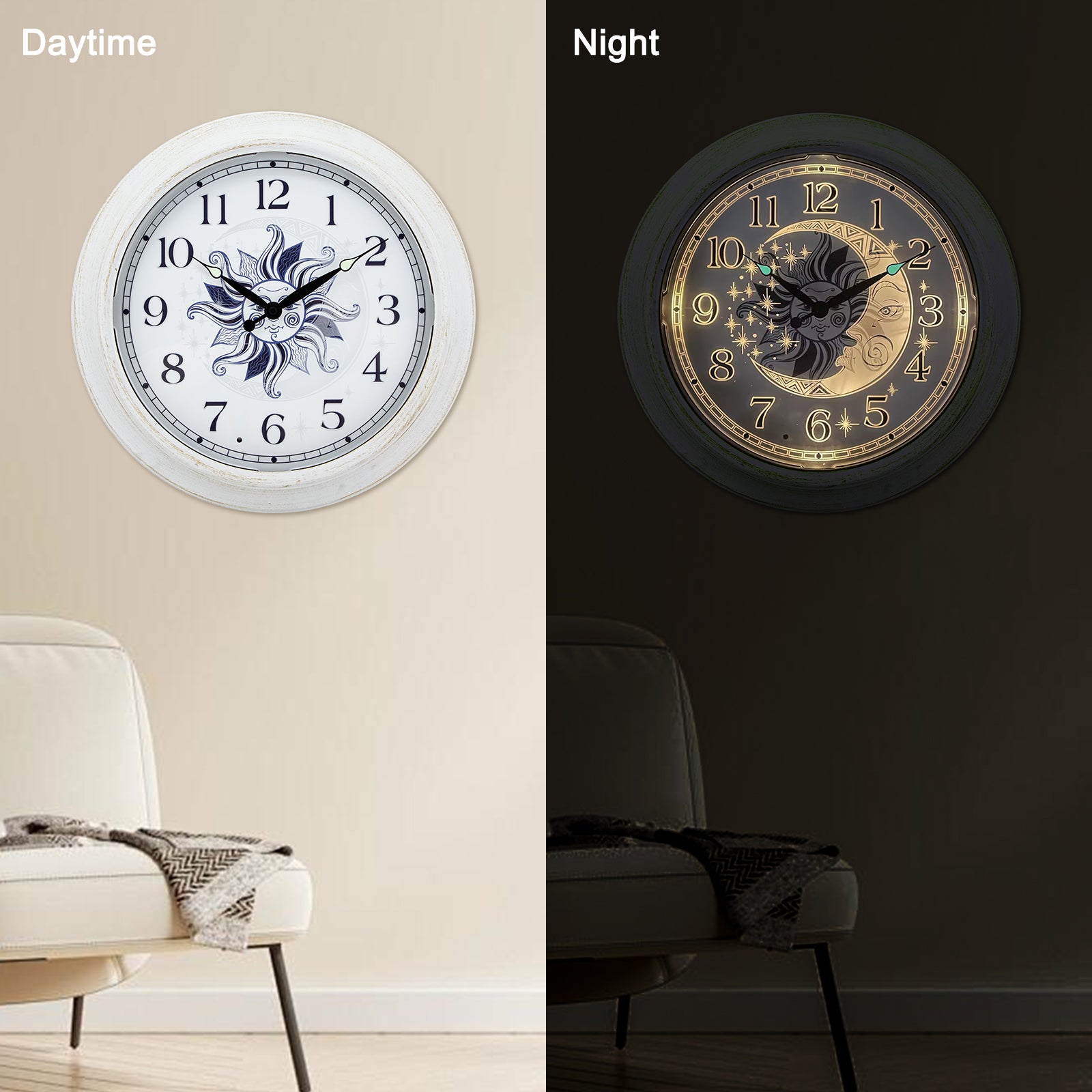 - Day & Night Transformation Design: The clock face transforms from a sun motif in daylight to a glowing moon pattern at night, illuminated by energy-efficient LED backlighting. Unlike ordinary clocks, this artistic timepiece creates ambiance for every moment. Even when the led light is not on, the fluorescence of the handle can see the time clearly