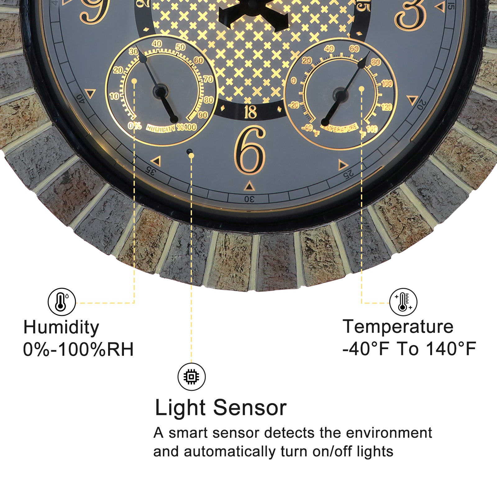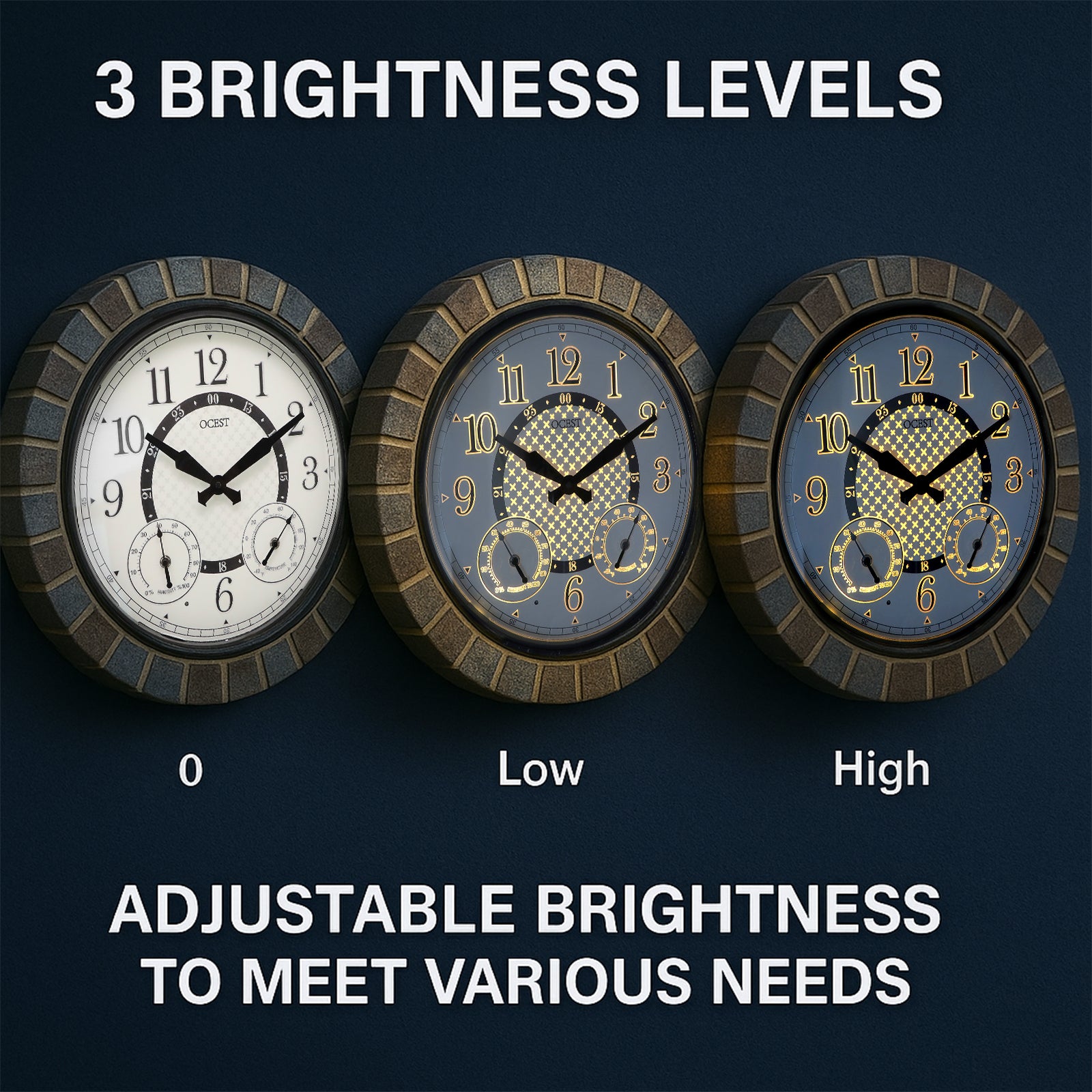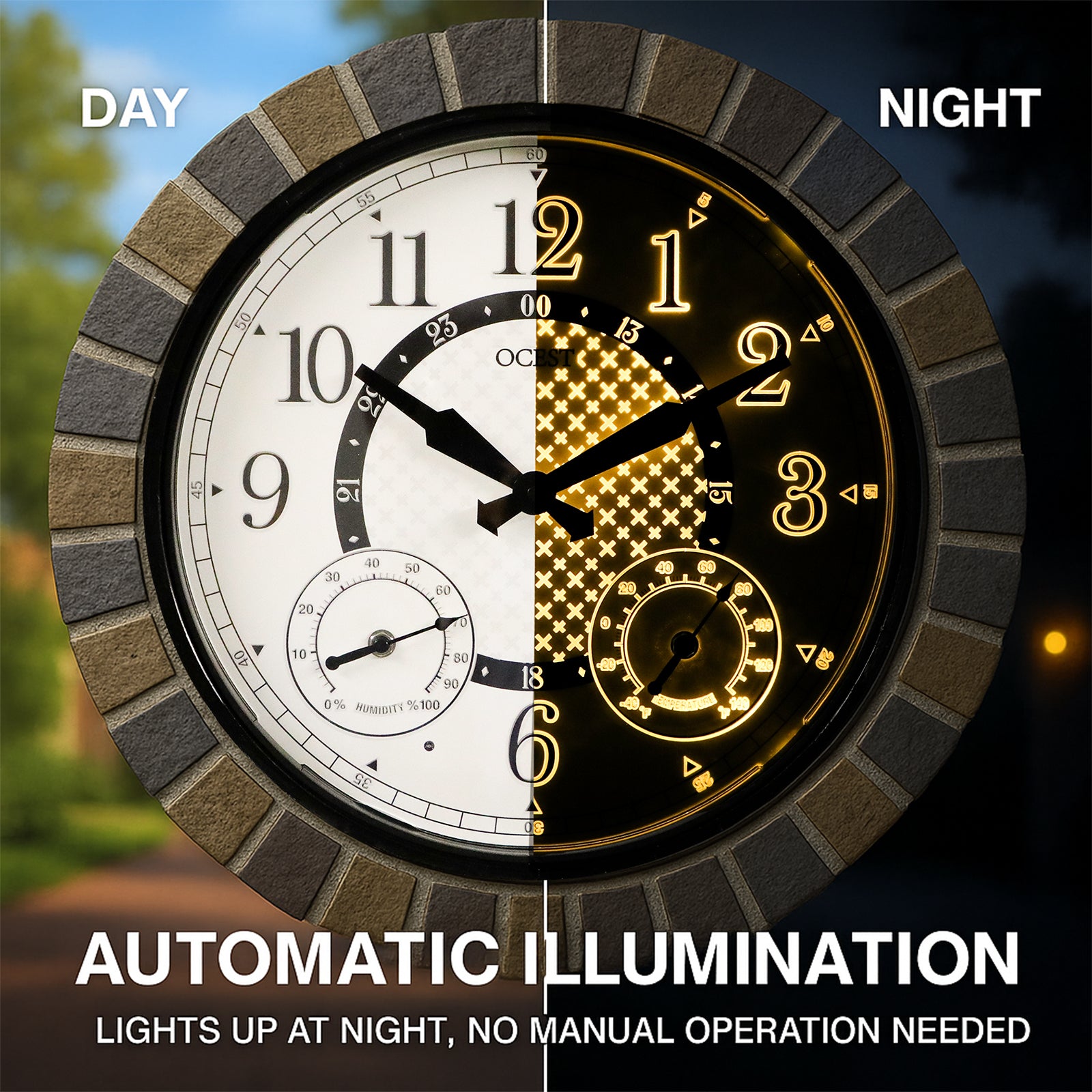 OCEST 18inch Large Indoor Outdoor Clock Illuminated Wall Clock with Thermometer Hygrometer & Night Light Waterproof Battery Operated Silent Non-Ticking