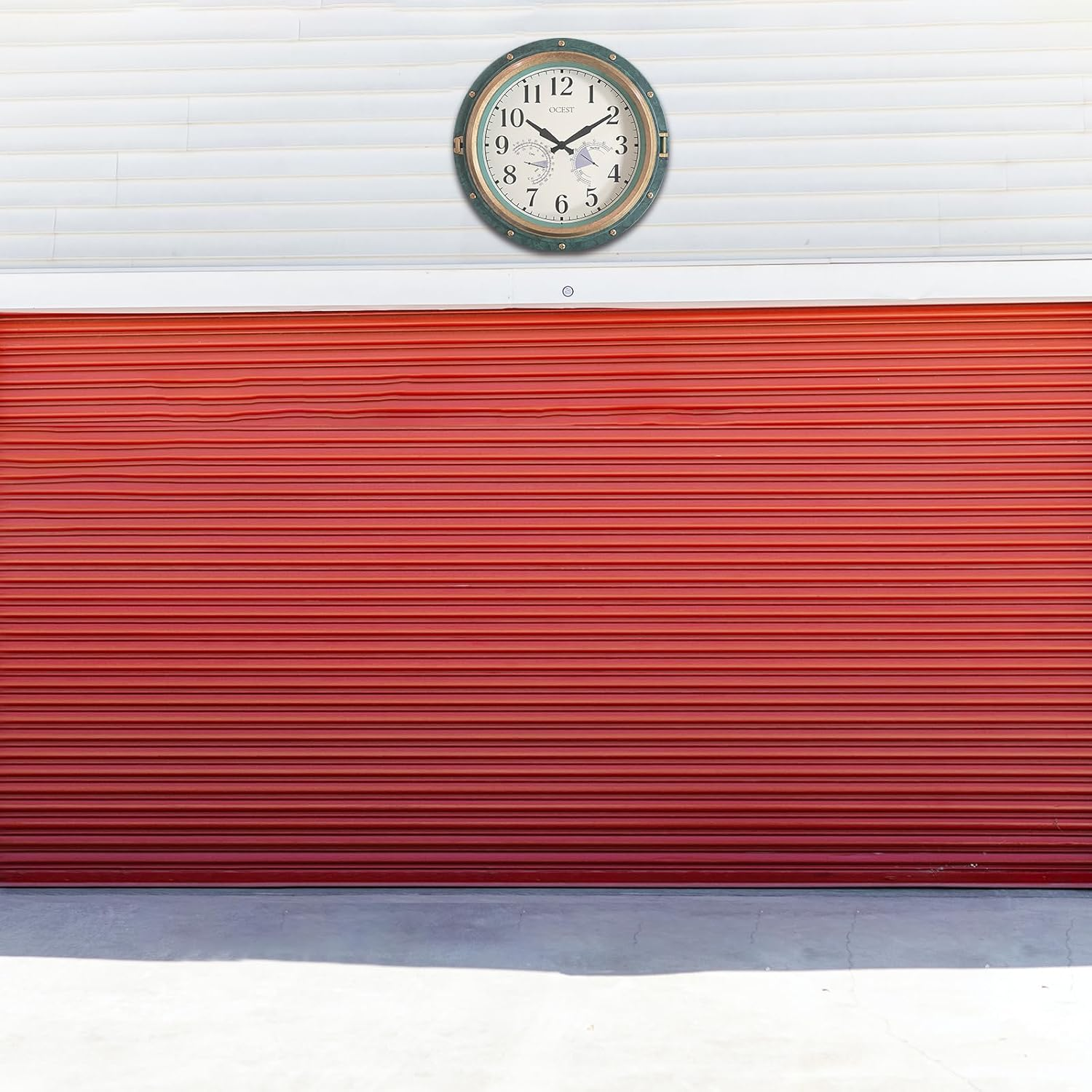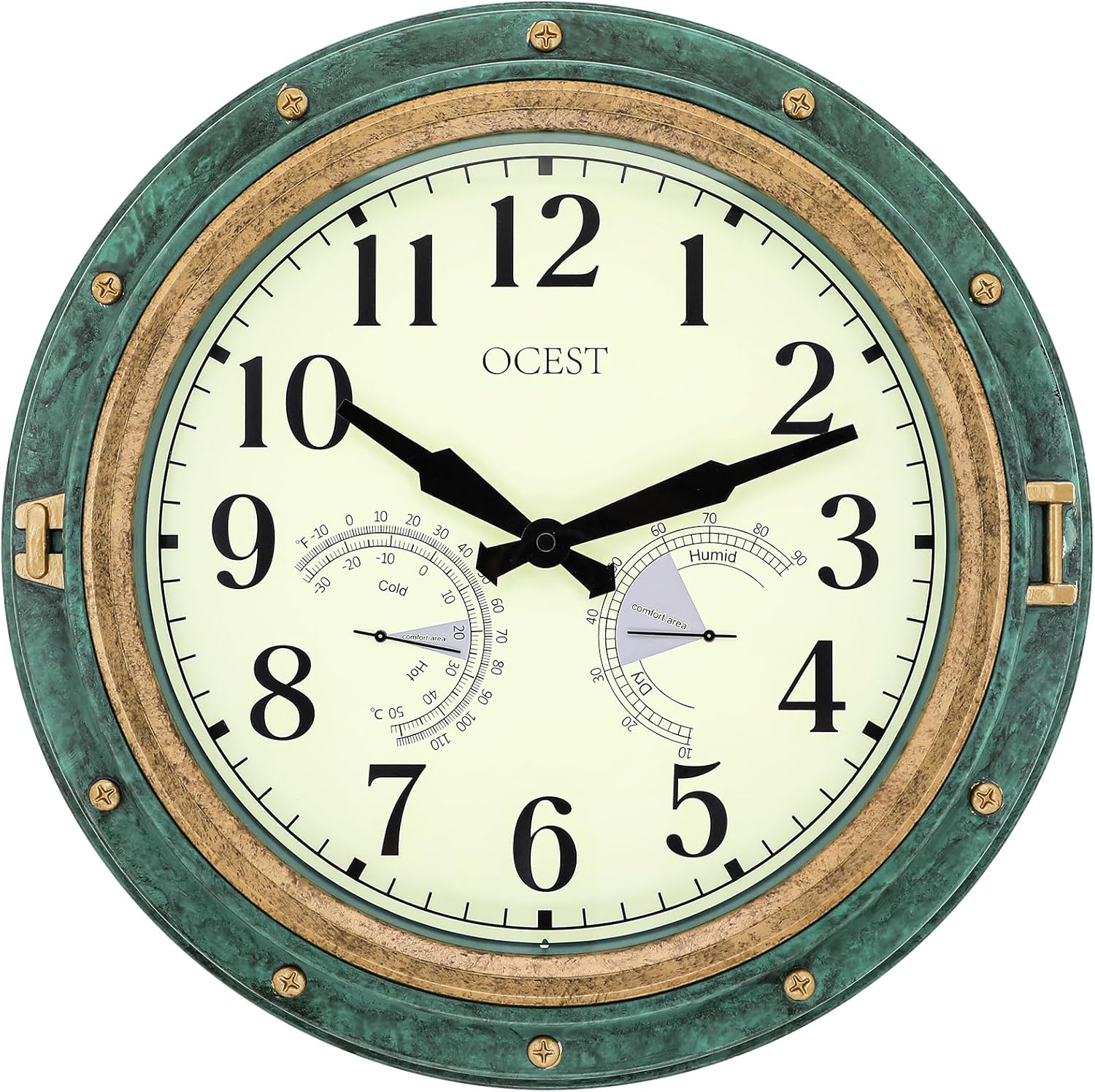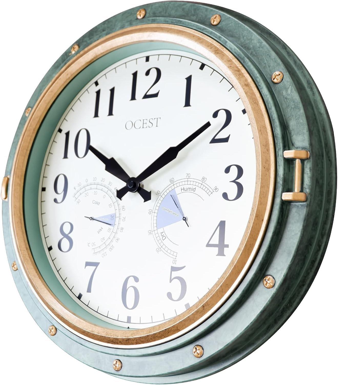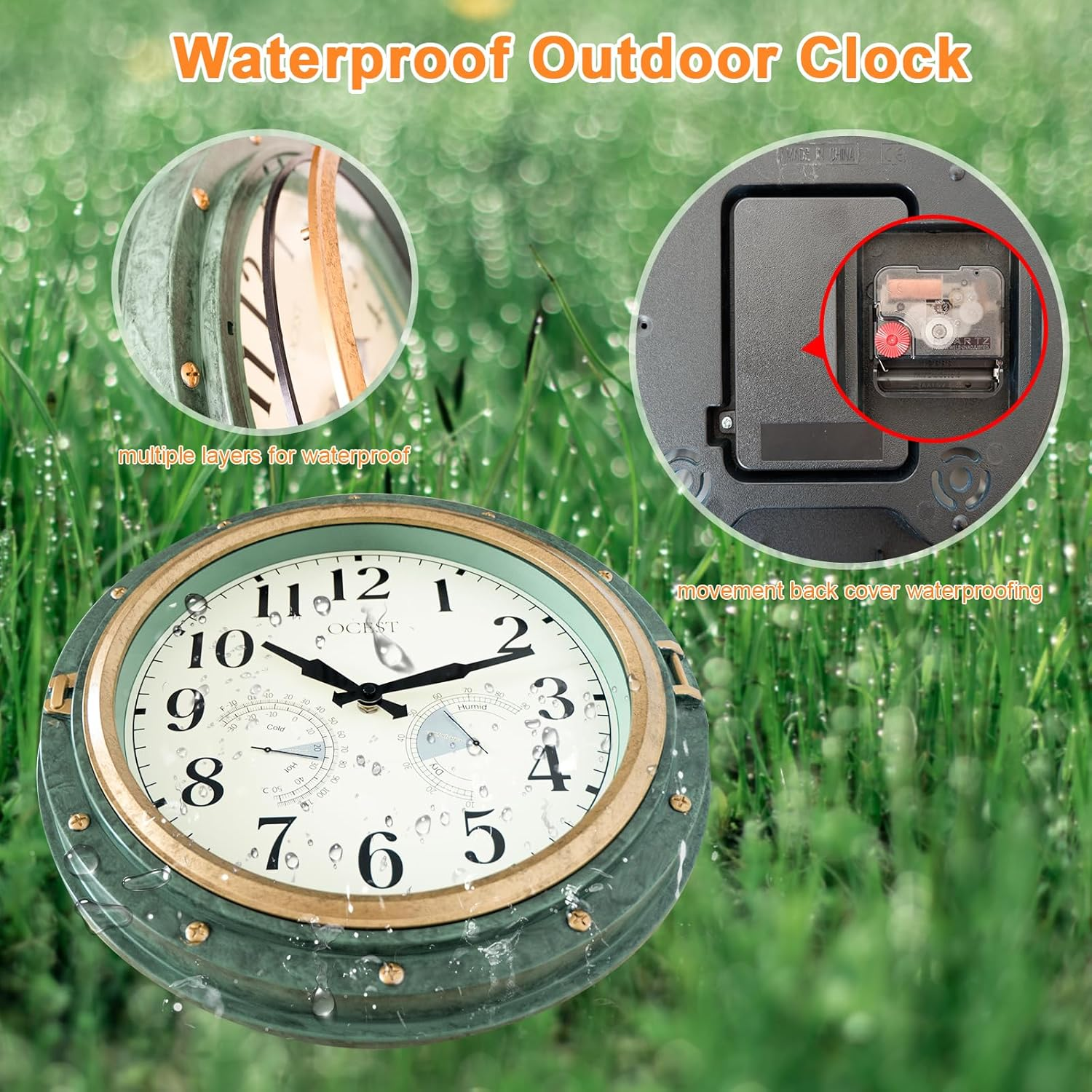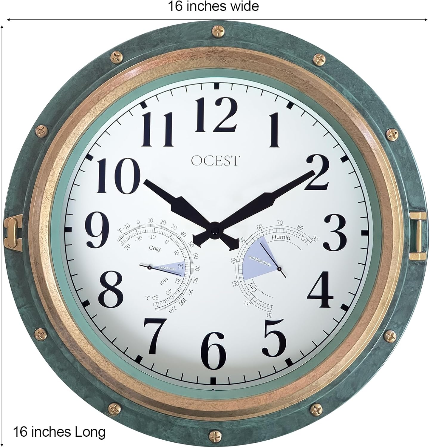 OCEST Indoor Outdoor Clock, 16 Inch Waterproof Wall Clock with Thermometer Hygrometer, Silent Non-Ticking Battery Operated Wall Clock for Home Decor, Patio(Retro Green)
