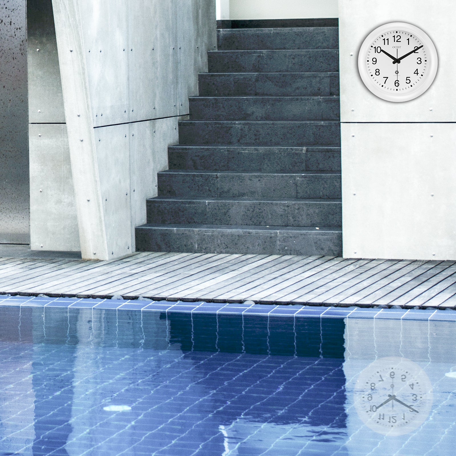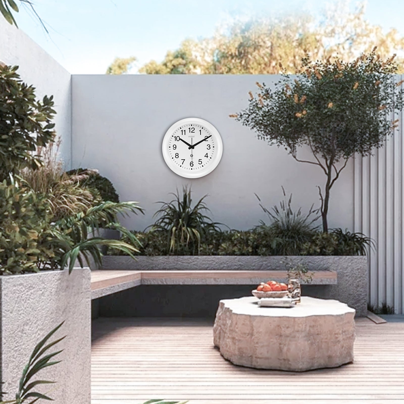 - Perfect Indoor Outdoor Clock-The hanging wall clock with excellent weather-resistant function can keep work properly in any heavy weather. A waterproof rear cover & Front rubber seal clock is great for mounting to pool, patio, garden, garage, yard, farmhouse, pool, kitchen, bedroom, or bathroom.