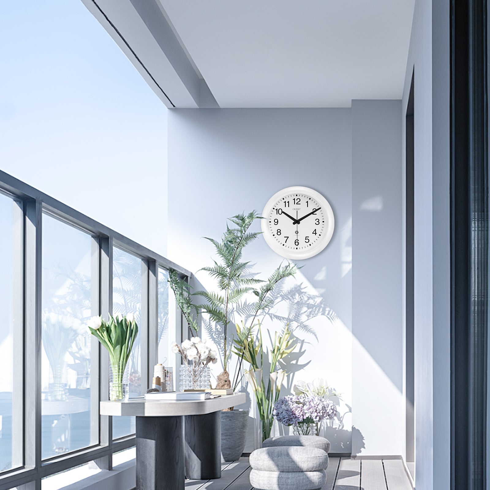 - Large Display Clock - Big 12-inch basic dial quartz wall clock with a black Arabic numeral analog display makes it easy to see from any corner of your pool, garden, patio, den, living room, or office. The sturdy plastic frame and Flat glass lens, make it easy to clean and keep dust away from the dial.