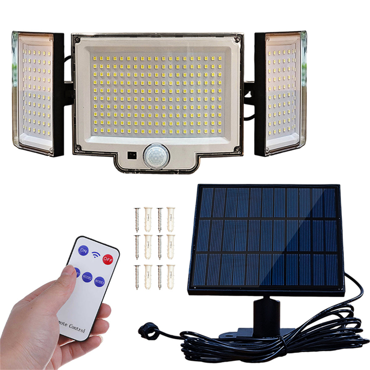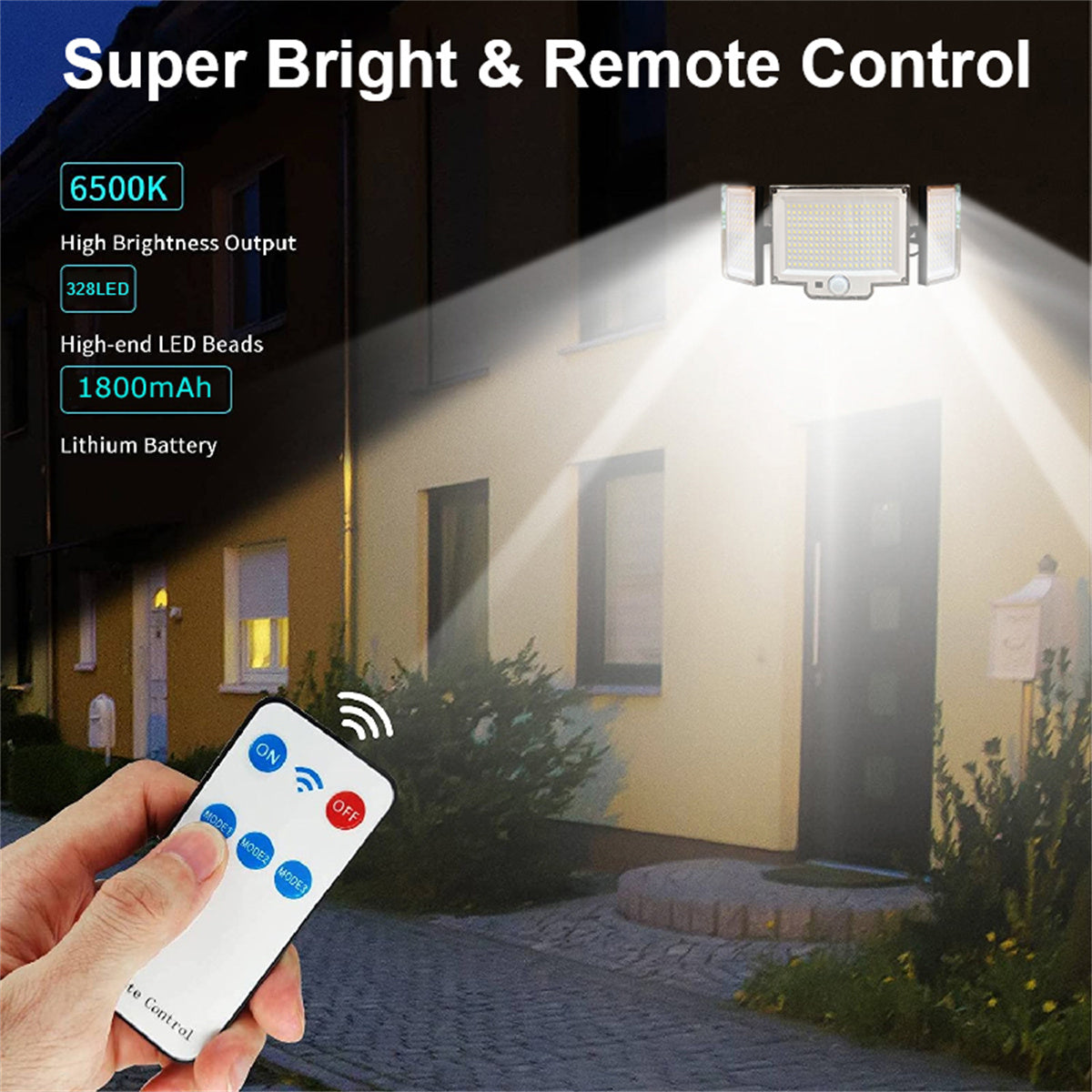 Super Bright Solar Flood Lights & 3 heads design: The solar motion detector lights equipped with 328 super bright LED beads, 6500K high brightness output and good heat dissipation. 3 adjustable heads design can move downwards, upwards and horizontally, makes it has wider lighting angle. Exterior flood lights detects up to 270° wide lighting angle. Perfectly illuminate your yard, garage, swimming pool.
