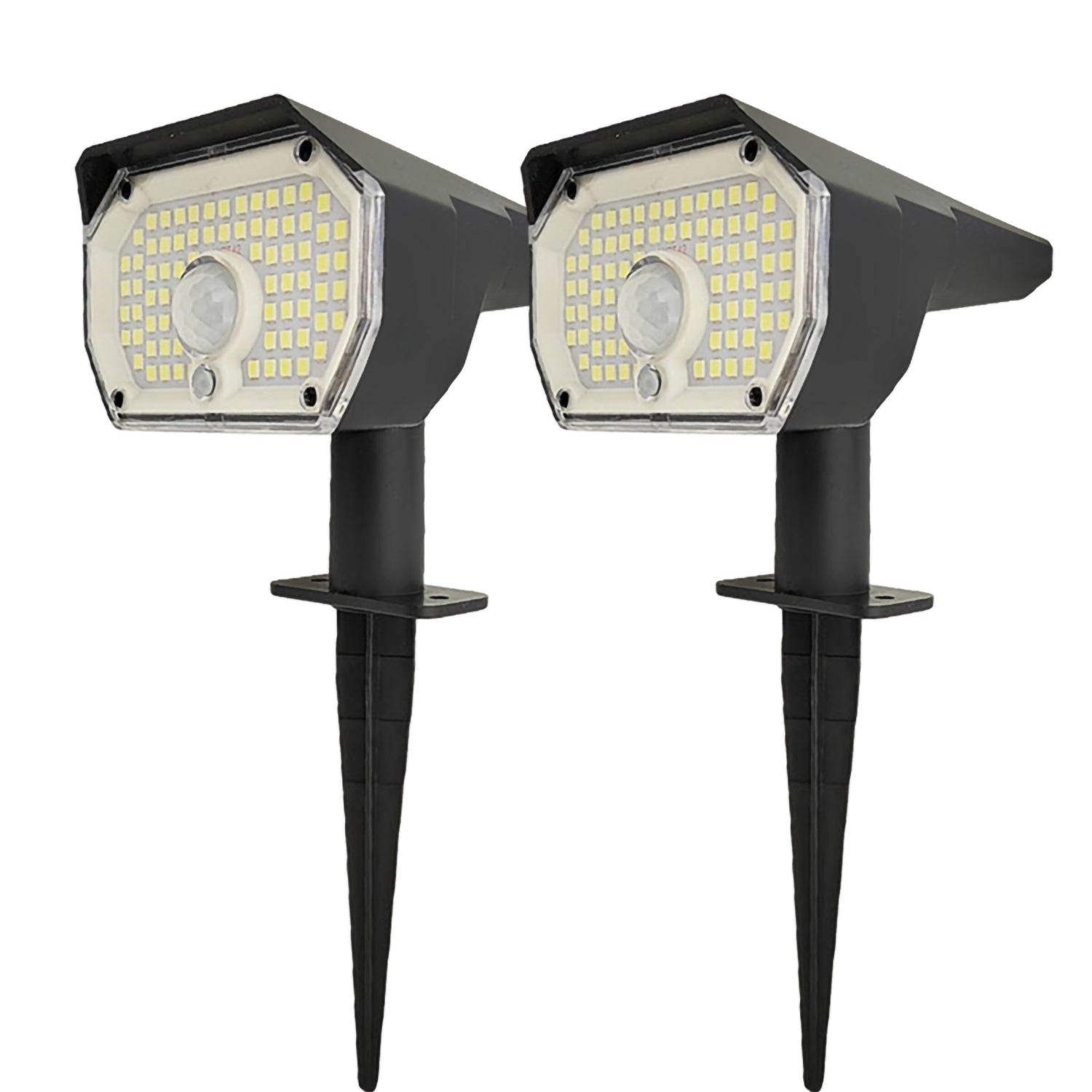 - Ultra-Bright & PIR Motion Sensor: New upgraded solar spotlights outdoor with 76LEDs each, it can produce up to 6500K brighter cool light in the dark, light up your garden and a larger area of landscape. Built-in sensitive PIR motion sensor with 120° detection angle, this will give safe, timely and efficient lighting when people, animals and vehicles pass by.