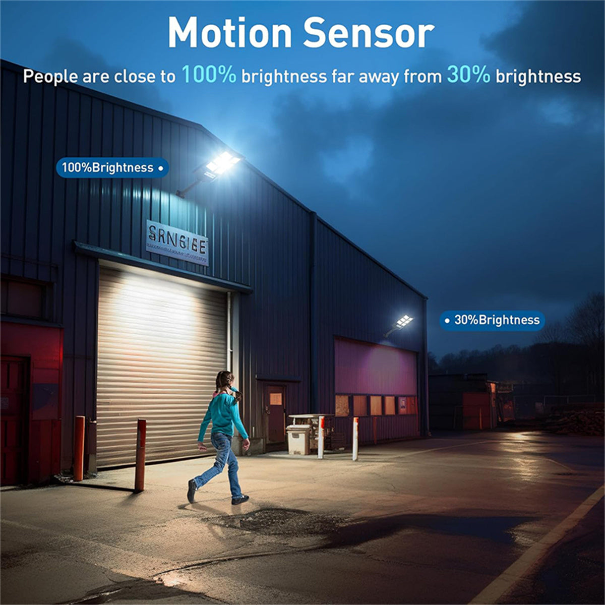 - Motion Sensor + Dusk to Dawn Mode + Remote Control: Motion Sensor: Solar Security Flood Light detects people approaching 100% brightness, people leaving 30% brightness, security and savings. This solar light also has an intelligent sensing dusk-to-dawn mode, which can be automatically turned on at dusk and off at dawn.Remote Control: Set 2/3/5/6/8 hours continuous normal lighting into motion sensing mode, 25%-100% brightness adjustment.